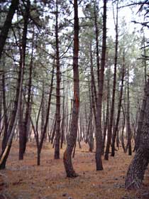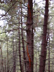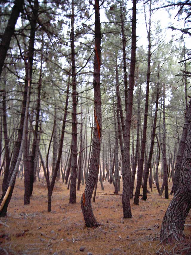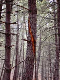 Pino en hélice *El día 10 de septiembre de 2007, cerca de las Casas del Pinar, me encontré este pino que ha sufrido, al parecer recientemente, un corte longitudinal en hélice que parte del suelo y llega hasta la copa. Este corte le ha arrancado la corteza y no ha tocado a madera.