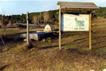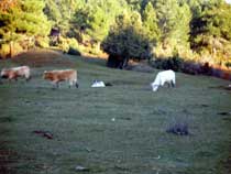 Vacas pastando con el mastín tumbado entre ellas Otra vista de la Dehesilla Panel informativo, al final de la ruta, en Muñecas